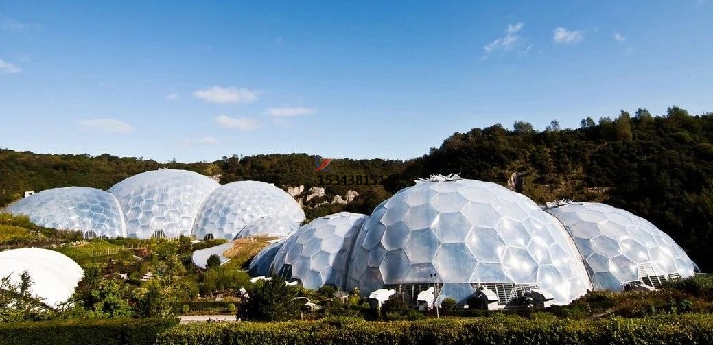 “伊甸園”項目位于英國的康沃爾郡,是在廢棄的礦山上建的全球最大的生態(tài)溫室。主要由8個充滿未來主義色彩的巨大蜂巢式穹頂建筑構成,其中每4座穹頂狀建筑連成一組。“伊甸園”的穹頂穹頂架由鋼管構成,拼成尺寸9米大小的六角形天窗,天窗中間鋪設半透明的ETFE薄膜材料。在形態(tài)上像放大了無數(shù)倍的“大水泡”。"大水泡"里培育著原產(chǎn)于非洲、亞洲、歐洲、大洋洲和美洲的熱帶植物。
