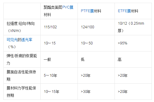 ETFE膜材料與PVC和PTEF織物膜材料的部分性能比較