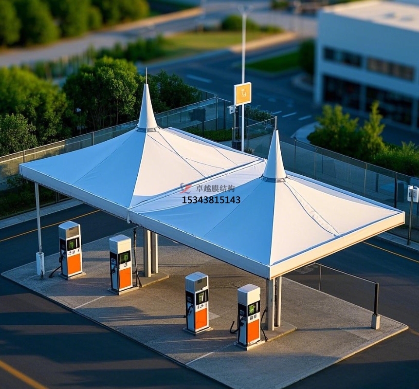 初期建設成本:相較于傳統(tǒng)混凝土或鋼結構雨棚,膜結構雨棚在初期建設成本上優(yōu)勢明顯。一方面,膜材價格相對親民,且重量輕,大幅降低對基礎工程要求。在地質(zhì)條件復雜地區(qū),傳統(tǒng)建筑需投入大量資金加固地基,而膜結構因荷載小,基礎施工簡單,可節(jié)省約 30% - 40% 的基礎建設成本。另一方面,膜結構安裝簡便,所需施工設備與人力少,能有效縮短施工周期。據(jù)統(tǒng)計,同等規(guī)模加氣站,膜結構雨棚施工時間通常比傳統(tǒng)結構縮短 1/3 - 1/2,不僅減少施工管理成本,還能使加氣站更快投入運營,提前創(chuàng)造經(jīng)濟效益。