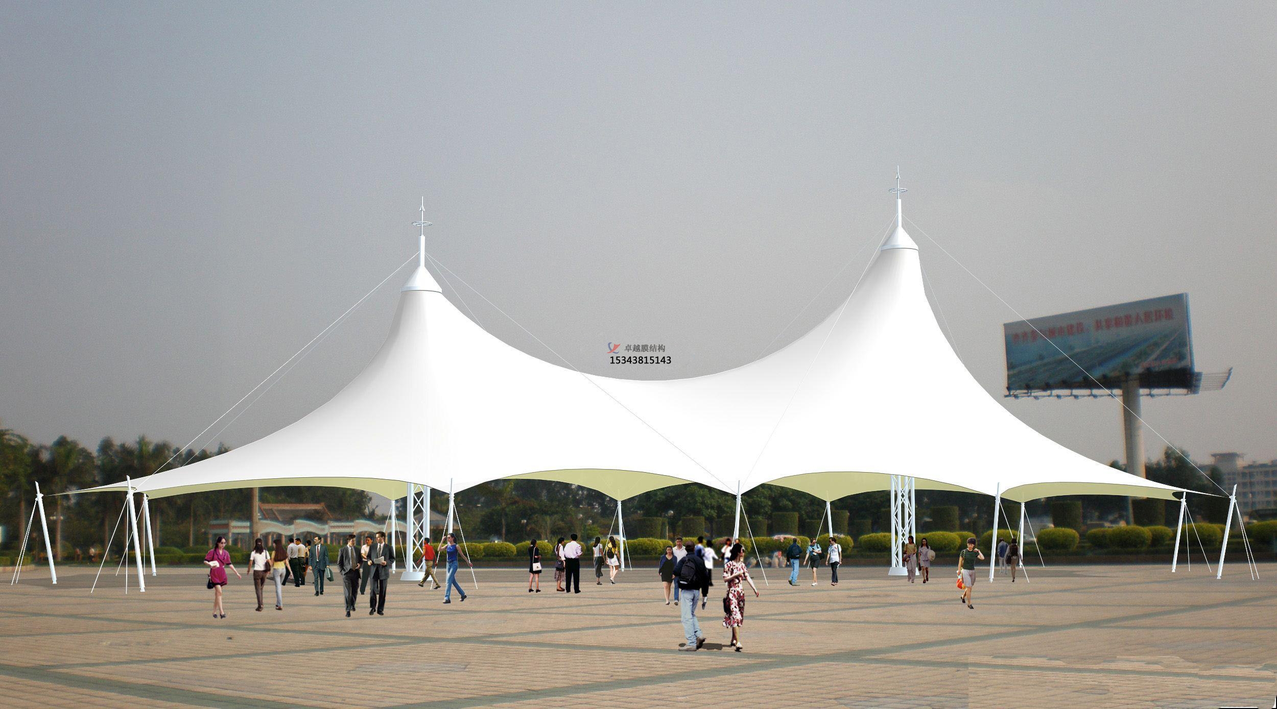 膜結(jié)構(gòu)景觀是建筑結(jié)構(gòu)中更新發(fā)展起來的一種形式,它以性能優(yōu)良的織物為材料,或是向膜內(nèi)充氣,由空氣壓力支撐膜面,或是利用柔性鋼索或剛性支撐結(jié)構(gòu)將面繃緊,從而形成具有一定剛度、能夠覆蓋大跨度空間的結(jié)構(gòu)體系。自從上世紀(jì)七十年代以來,膜結(jié)構(gòu)景觀在國外已逐漸應(yīng)用于體育建筑、商場、展覽中心、交通服務(wù)設(shè)施等大跨度建筑中。膜結(jié)構(gòu)景觀已成為結(jié)構(gòu)設(shè)計選型中的一個主要方案。
