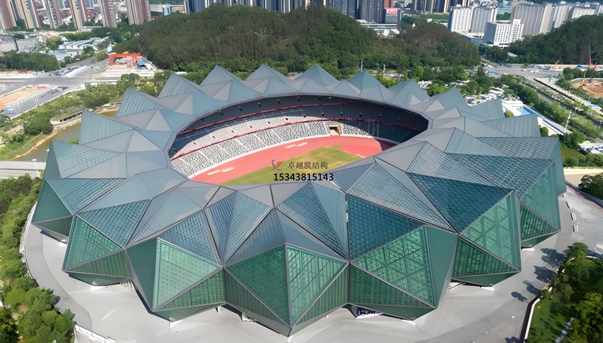 深圳大運會體育中心一場兩館采用空間折板結(jié)構(gòu),外觀類似“鉆石”。外層采用陽光板及玻璃幕墻,內(nèi)層采用透光率高、吸音率強、自潔性能好的網(wǎng)格內(nèi)膜材料。深圳大運會體育中心的網(wǎng)格內(nèi)膜面積超過10萬平方米。