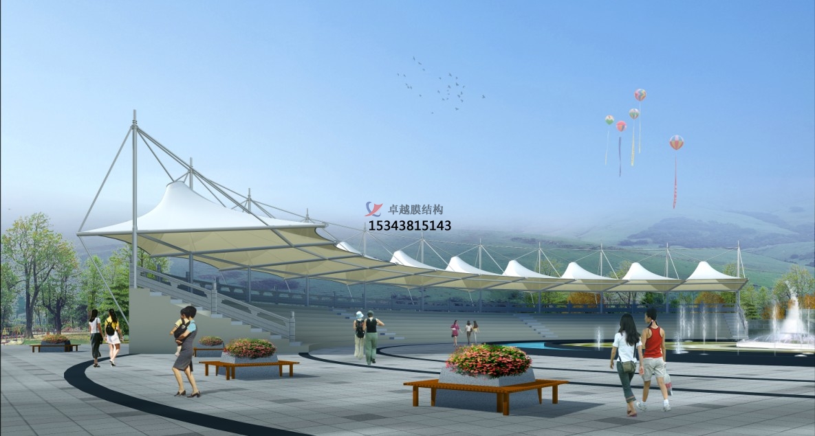 索膜結(jié)構(gòu)看臺景觀應(yīng)用場景:其應(yīng)用場景廣泛,可在教育領(lǐng)域、公共空間、商業(yè)與文旅等場景使用。在教育領(lǐng)域內(nèi),學(xué)校操場看臺提供遮陽避雨功能,適用于運動會、升旗儀式等集體活動,其開放結(jié)構(gòu)增強空間互動性,為師生提供舒適的觀看空間,也為校園增添了現(xiàn)代化的景觀元素;在公共空間,城市公園、廣場,作為休憩亭或藝術(shù)裝置,提升景觀趣味性與實用性,由于其大跨度覆蓋看臺及賽場,無立柱設(shè)計保障視野開闊,輕量化結(jié)構(gòu)提升抗震性等特性,尤其適合在體育場館應(yīng)用;在商業(yè)與文旅中,商業(yè)街區(qū)臨時展區(qū)、景區(qū)廊亭等,通過膜結(jié)構(gòu)打造標(biāo)志性視覺焦點,吸引人流并承載多功能需求,同時與自然景觀相融合,成為景區(qū)的一道亮麗風(fēng)景線。