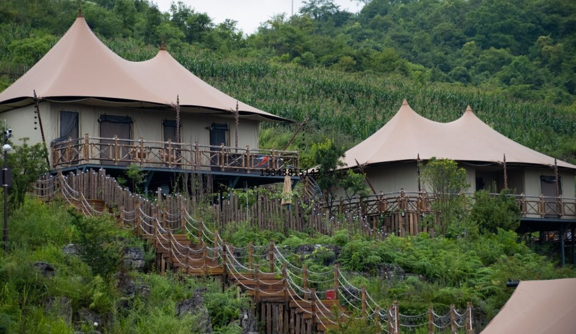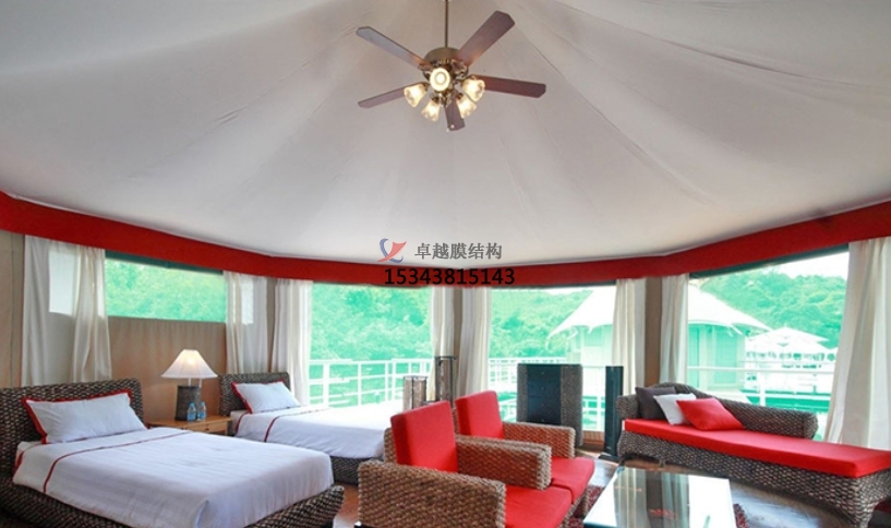 膜結(jié)構(gòu)帳篷酒店膜材是一種無(wú)毒的高分子材料。它具有無(wú)味的特點(diǎn),安裝后沒有一絲味道。另外,它擁有抗紫外線和反射光線極強(qiáng)的特點(diǎn),而且其抗撕裂的性能強(qiáng),還有B1/M2級(jí)別的阻燃性能,并且使用壽命極強(qiáng),一般壽命都在20年以上。