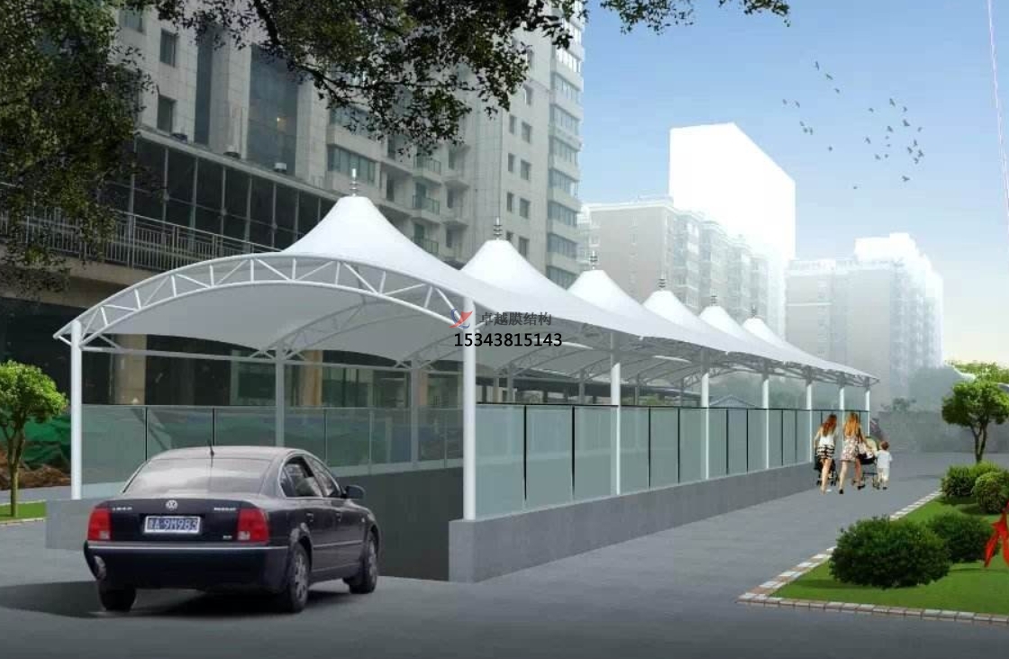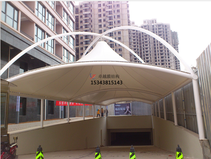 車庫(kù)出入口膜結(jié)構(gòu)頂棚是一種現(xiàn)代化的建筑結(jié)構(gòu),它采用高強(qiáng)度、耐久性的膜材料,通過鋼骨架、拉索、張力桿等構(gòu)件,形成一種穩(wěn)定的空間形態(tài),用于車庫(kù)出入口的遮陽(yáng)和防護(hù)。這種結(jié)構(gòu)不僅具有良好的透光性和抗風(fēng)能力,而且設(shè)計(jì)簡(jiǎn)潔美觀,非常有現(xiàn)代感。