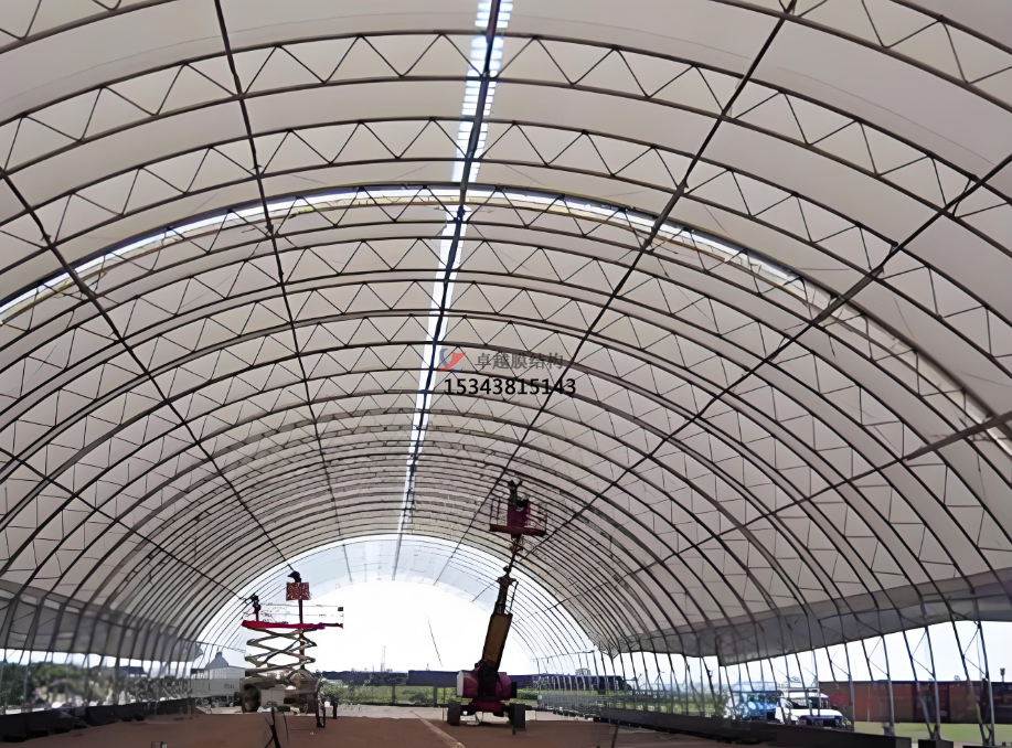 膜結(jié)構(gòu)煤棚的施工采用模塊化安裝方式,先在工廠預(yù)制好鋼結(jié)構(gòu)骨架和膜材單元,然后運(yùn)輸?shù)浆F(xiàn)場(chǎng)進(jìn)行拼裝。這種方式不僅縮短了施工周期,還減少了現(xiàn)場(chǎng)作業(yè)的風(fēng)險(xiǎn)。在施工過程中,通過液壓同步張拉技術(shù),對(duì)膜材的張力進(jìn)行精確控制,確保膜材的應(yīng)力分布均勻。