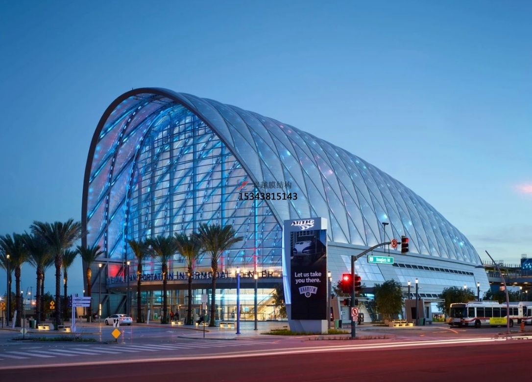 ETFE設(shè)計強度低,單層ETFE適用于跨度較小的結(jié)構(gòu),比較典型的應(yīng)用是設(shè)置于桁架弦桿之間,形成采光帶,且通過ETFE與PVC/PTFE不同材質(zhì)的組合使用,產(chǎn)生更為豐富的視覺效果。