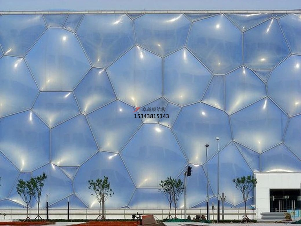 張拉膜結構可以根據(jù)需要制成任意復雜曲面形狀,體現(xiàn)自然流暢之美;并有多種顏色的膜材可選,以適應周邊的環(huán)境、滿足建筑效果要求;而且膜結構質量輕,一般不需要太龐大的支撐結構,這是其他建筑材料無法比擬的優(yōu)勢所在。