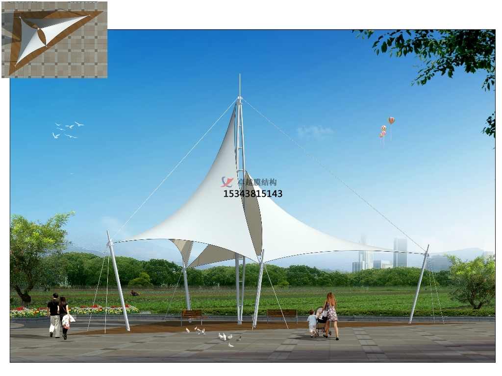 6、景觀設施:膜結構以其特殊的建筑表現(xiàn)手法,主要體現(xiàn)在造型、漫射透光性、豐富多彩,可廣泛應用于入口、標志性小品 、步行街、停車場等,其他建筑特性無須較高要求。