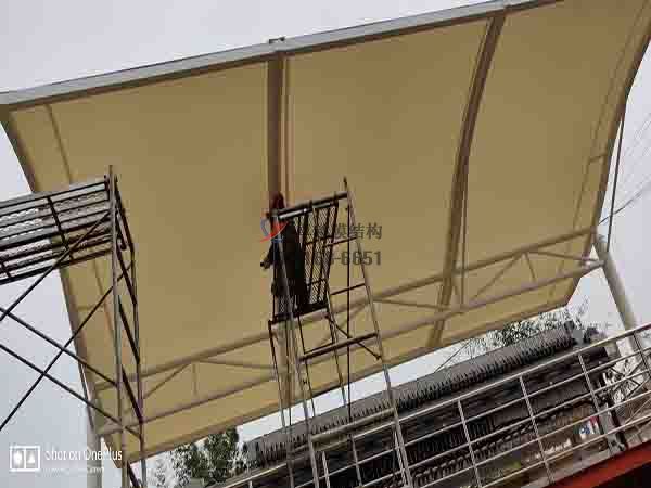 本工程膜材采用白色高端國產膜材PVDF高自潔環(huán)保建筑膜材,鋼結構采用更好的標準Q235B鋼材,表面采用酚醛底漆處理,面漆采用白色鋼結構專用快干磁漆。