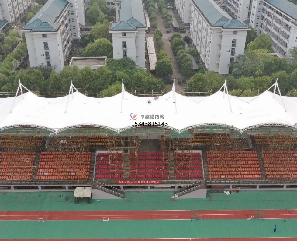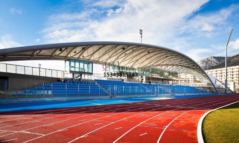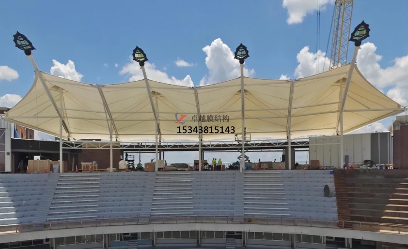 膜結(jié)構(gòu)體育看臺(tái)是以高強(qiáng)度柔性薄膜材料(如ETFE、PTFE、PVDF等)為覆蓋層,通過鋼索、鋼結(jié)構(gòu)框架或張力系統(tǒng)形成預(yù)張應(yīng)力空間結(jié)構(gòu)的建筑形式24。其設(shè)計(jì)融合建筑力學(xué)與材料科技,既能實(shí)現(xiàn)大跨度無柱懸挑,又能塑造流線型外觀,滿足體育場館寬視野、低荷載的建造需求。