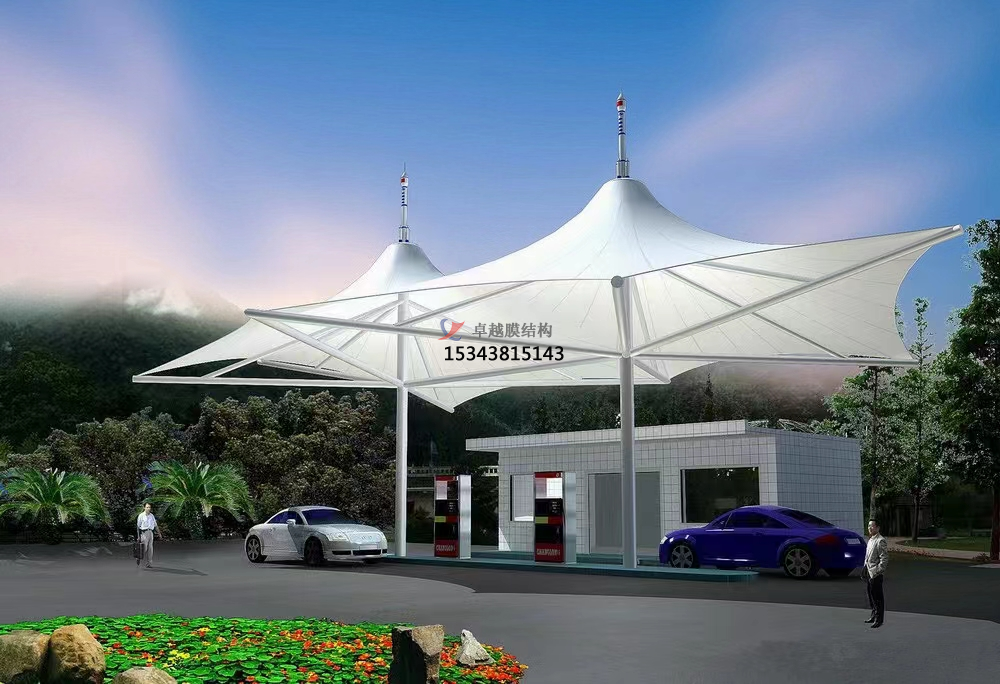 另外,案例鶴壁某地加油站中,設(shè)計(jì)師也采用了膜結(jié)構(gòu)建造了罩棚。該罩棚采用了多層膜結(jié)構(gòu),每一層膜都采用了不同的顏色,使得罩棚看起來色彩豐富、絢麗多彩。同時(shí),膜結(jié)構(gòu)的柔性好,使得罩棚可以根據(jù)不同的場(chǎng)地需求進(jìn)行靈活調(diào)整,提高了車輛的使用體驗(yàn)。