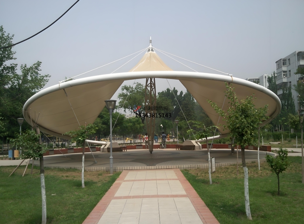 遮陽與擋雨:在戶外公共空間中,景觀膜結(jié)構(gòu)常被用作遮陽篷、雨篷或涼亭,為游客提供舒適的休憩環(huán)境。其大跨度的設(shè)計(jì)能夠覆蓋較大的區(qū)域,滿足不同天氣條件下的使用需求。