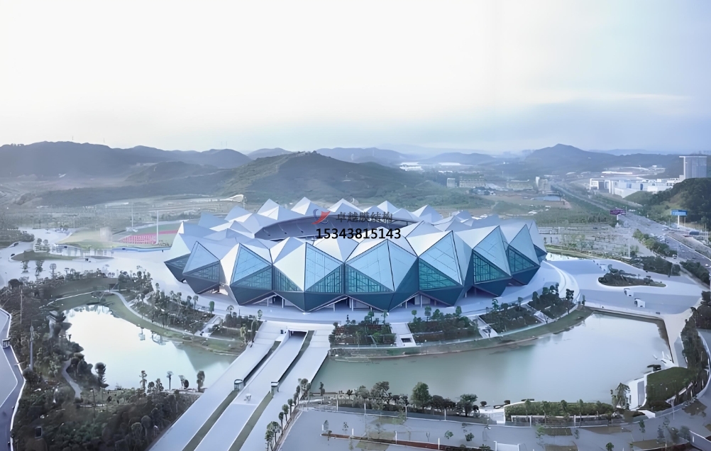 深圳大運會體育中心一場兩館采用空間折板結構,外觀類似“鉆石”。外層采用陽光板及玻璃幕墻,內(nèi)層采用透光率高、吸音率強、自潔性能好的網(wǎng)格內(nèi)膜材料。深圳大運會體育中心的網(wǎng)格內(nèi)膜面積超過10萬平方米。