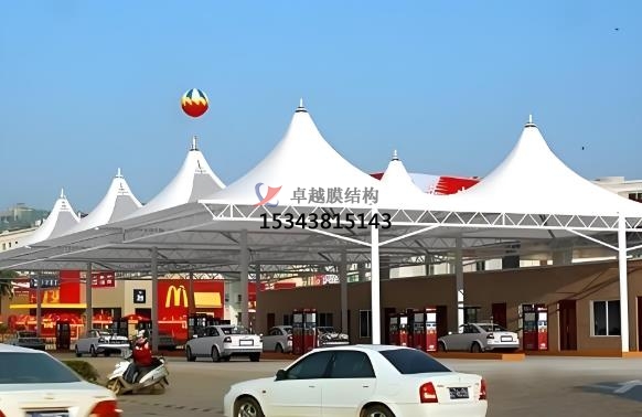 加油站張拉膜特點(diǎn):造型美觀,透光性好,節(jié)能環(huán)保,抗震性強(qiáng),施工便捷,經(jīng)濟(jì)性好。張拉膜結(jié)構(gòu)可通過獨(dú)特的曲面造型和豐富色彩,為加油站營(yíng)造出現(xiàn)代、時(shí)尚的外觀,與周邊環(huán)境相融合,成為城市景觀的一部分。膜材具有較高的透光率,一般在 10%-20% 左右,部分可達(dá) 30% 以上,可提供自然采光,減少白天人工照明需求,節(jié)約能源。透光膜材可引入自然光減少照明能耗,結(jié)合自然通風(fēng)設(shè)計(jì)降低空調(diào)使用率,材料可回收性符合綠色建筑標(biāo)準(zhǔn),張拉膜具有良好的保溫隔熱性能,能有效降低加油站內(nèi)部能耗,配合節(jié)能照明設(shè)備,可實(shí)現(xiàn)綠色環(huán)保目標(biāo)。自重輕、柔性大,在風(fēng)荷載、雪荷載等外部荷載作用下,能通過變形分散荷載,具有良好的抗震性能,可抵抗 8 級(jí)地震。加油站膜結(jié)構(gòu)大部分構(gòu)件在工廠預(yù)制完成,現(xiàn)場(chǎng)組裝和安裝速度快,施工周期可比傳統(tǒng)建筑方式縮短一半以上,且對(duì)環(huán)境影響小,膜材料重量輕但強(qiáng)度高,降低支撐結(jié)構(gòu)負(fù)荷,安裝周期短,減少對(duì)加油站運(yùn)營(yíng)的影響。張拉膜結(jié)構(gòu)廣泛應(yīng)用于加油站頂棚設(shè)計(jì),覆蓋加油區(qū)和洗車區(qū)域,為車輛及人員提供遮陽(yáng)、防雨、防雪的全天候保護(hù)。在高速公路服務(wù)區(qū)、城市主干道等車流量密集區(qū)域,部分加油站結(jié)合張拉膜結(jié)構(gòu)擴(kuò)展服務(wù)功能,例如設(shè)置司機(jī)休息區(qū)、戶外餐飲區(qū)或小型便利店,通過靈活的空間布局提升用戶體驗(yàn),其高效覆蓋能力尤為突出。雖然膜材和鋼結(jié)構(gòu)等材料成本相對(duì)較高,但由于施工周期短、維護(hù)成本低,長(zhǎng)期來看綜合成本具有優(yōu)勢(shì),且使用壽命可達(dá) 15-30 年甚至更長(zhǎng)。