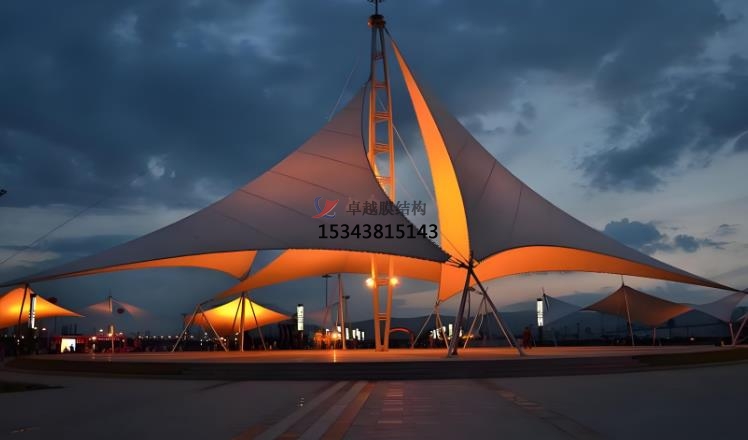 張拉膜景觀的應(yīng)用場景:商業(yè)空間,文化設(shè)施,運(yùn)動(dòng)場地,旅游景點(diǎn)。在商業(yè)空間中,如購物中心、商業(yè)廣場的入口、中庭等,可吸引顧客目光,提升商業(yè)氛圍。在文化設(shè)施中博物館圖書館等文化場所,可營造開放、溫馨的室內(nèi)環(huán)境,增添文化藝術(shù)氣息。在運(yùn)動(dòng)場地中足球場、籃球場等運(yùn)動(dòng)場館的屋頂或看臺,實(shí)現(xiàn)大跨度覆蓋,為觀眾和運(yùn)動(dòng)員提供良好的空間環(huán)境。在旅游景點(diǎn)景區(qū)大門、游客服務(wù)中心、觀景臺等,可彰顯地域特色,為游客提供遮陽避雨的空間。張拉膜景觀材料可在工廠預(yù)制,現(xiàn)場安裝快速高效,大大縮短施工周期。這種結(jié)構(gòu)通常采用預(yù)應(yīng)力拉索體系,利用邊鎖的拉力和膜材的形狀構(gòu)成造型,盡可能減少結(jié)構(gòu)體型對膜材視覺的影響常用彩色膜材以體現(xiàn)其千變?nèi)f化的浪漫情懷。其靈活的設(shè)計(jì)和組合方式,使其能夠適應(yīng)各種復(fù)雜的地形和環(huán)境。張拉膜景觀在設(shè)計(jì)中,會充分結(jié)合當(dāng)?shù)氐臍夂?、景觀和文化背景,使其不僅具有功能性,還能成為地域文化的象征,提升旅游地區(qū)的品質(zhì)形象。此外,張拉膜材料本身具有顯色性,在夜間彩燈的映射下能形成絢麗繽紛的景觀效果,為人們帶來時(shí)尚、輕松的休閑感受。