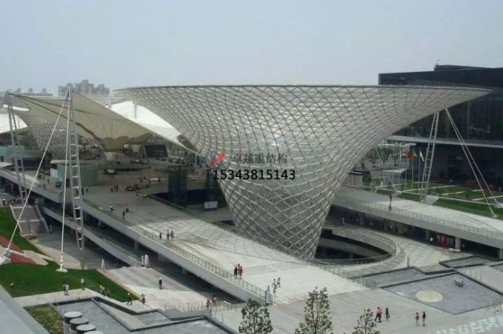 上海世博會(huì)世博軸膜結(jié)構(gòu)陽(yáng)光谷。位于世博浦東園區(qū)的中心區(qū)域,南北長(zhǎng)1045米,東西寬約110米,整體高40多米。作為到達(dá)世博主要場(chǎng)館的主入口,它起到了關(guān)鍵的引導(dǎo)交通和人流的作用。世博軸縱向設(shè)置了6個(gè)巨型圓錐體井狀采光結(jié)構(gòu)的“陽(yáng)光谷”。世博軸外周設(shè)置了31根梭形柱,每根梭形柱至少設(shè)置了兩根拉地索。內(nèi)部還設(shè)置了19根桅桿柱,內(nèi)外柱子之間都通過(guò)高強(qiáng)鋼索相互連接。世博軸膜結(jié)構(gòu)采用Sheerfill I膜,共有69片單元,展開(kāi)面積達(dá)68000平方米,更大的單片膜面積為1780平方米,相當(dāng)于4個(gè)標(biāo)準(zhǔn)籃球場(chǎng),這些在世界建筑史上都是獨(dú)樹(shù)一幟的。從美觀角度考慮,在帽環(huán)處,局部采用雙層膜,整個(gè)建筑像一朵玻璃的喇叭花從地下悄然綻放,晶瑩剔透。該工程是國(guó)內(nèi)更大的全張拉索膜結(jié)構(gòu)工程,創(chuàng)造了膜結(jié)構(gòu)施工的奇跡。