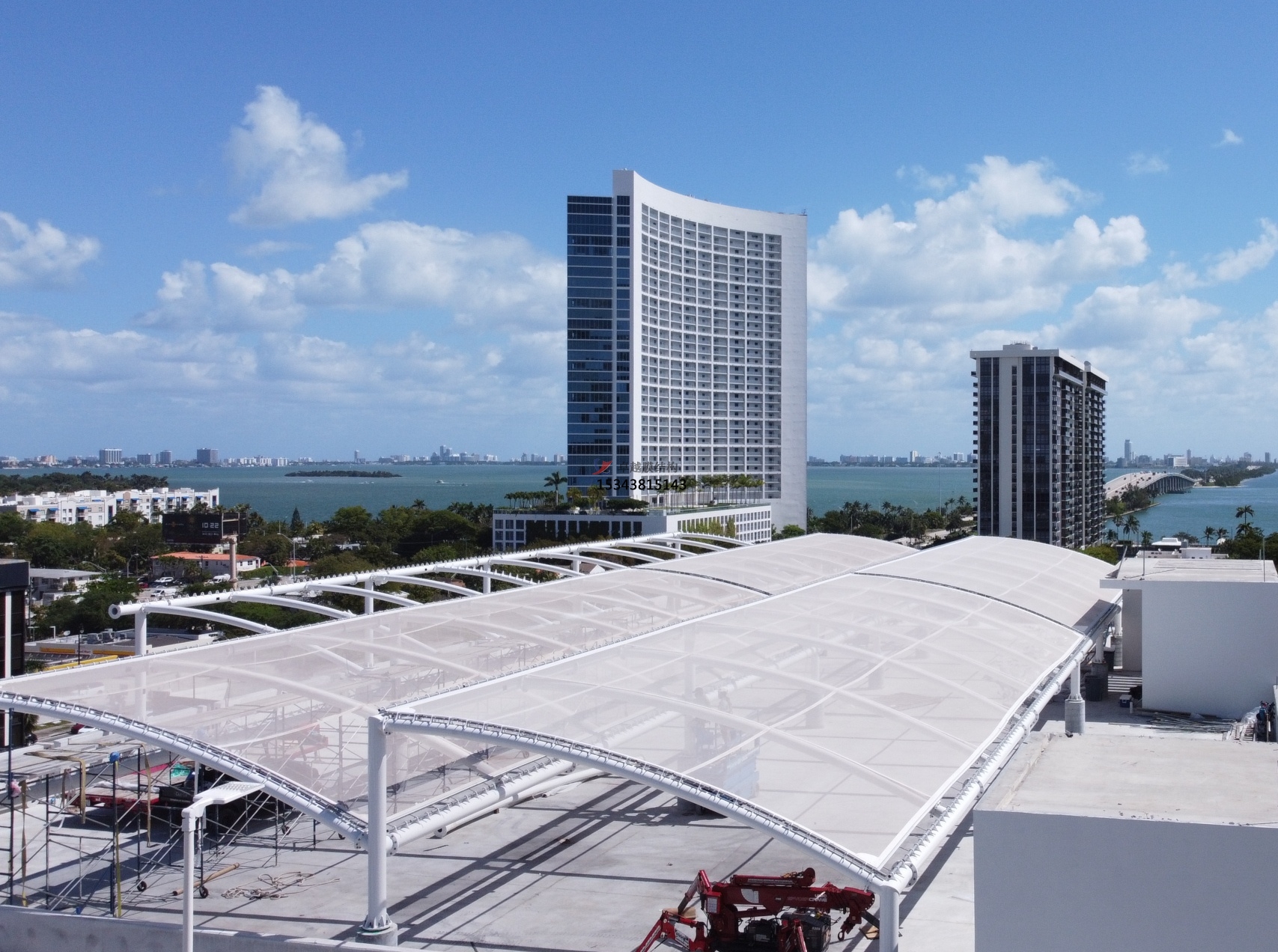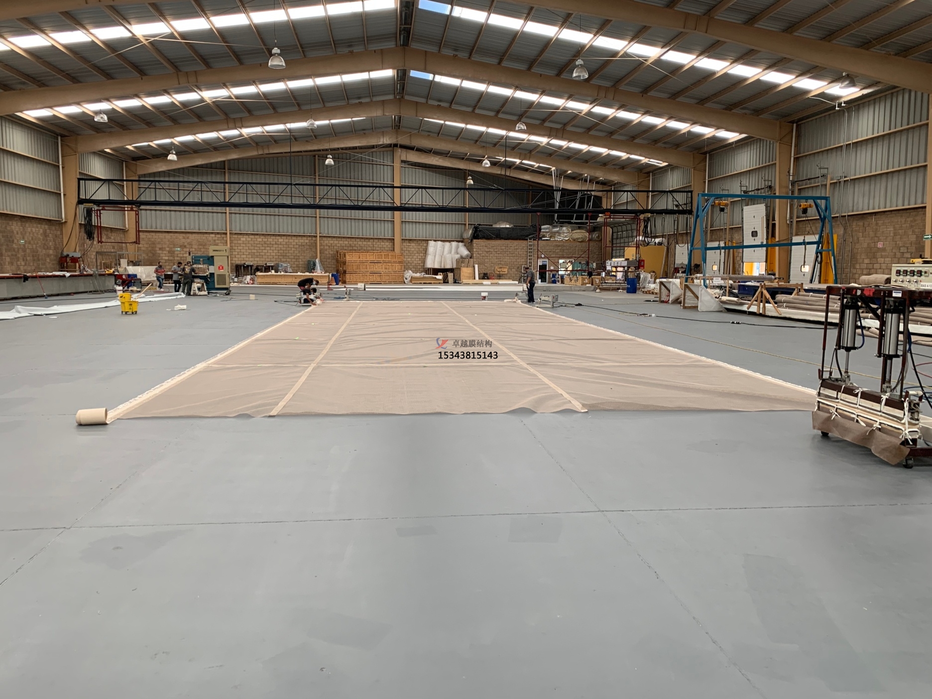 膜結(jié)構(gòu)工程的加工制造膜材的首要加工流程包含: 進料-查驗?zāi)げ?膜片下料-編號-膜片編排放樣-膜片初粘-駁接-包裝。因為膜材的裁剪、包裝進程都較為復(fù)雜, 各種角度改變較多, 且加工精度請求非常高, 所以在制造進程中要加強質(zhì)量管理, 保證制造精度?! ?br />