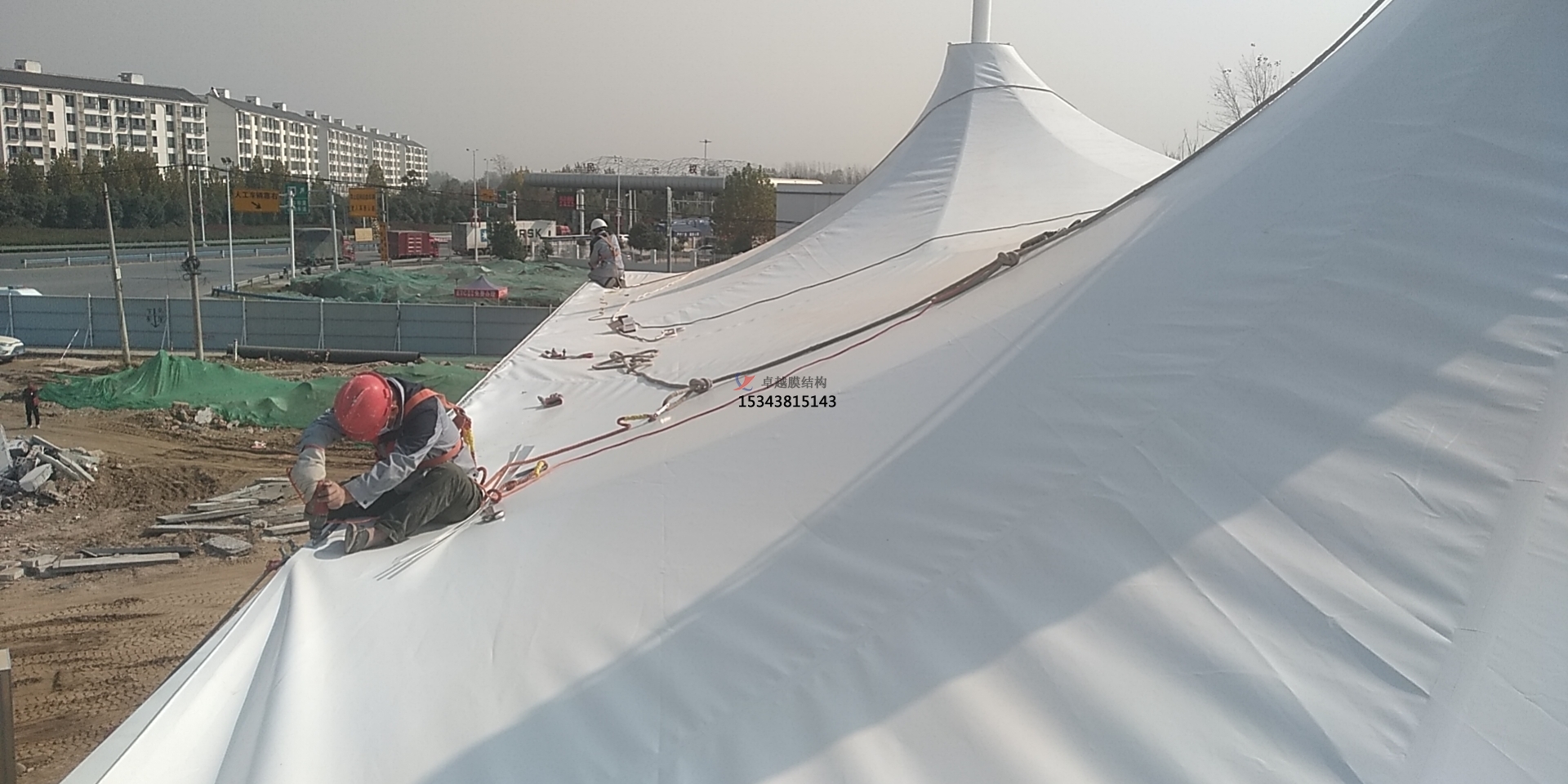 7、對(duì)邊角及有褶皺的區(qū)域進(jìn)行局部張拉調(diào)節(jié),并最終固定膜面及節(jié)點(diǎn);完成雨水系統(tǒng)安裝及防水覆蓋等。