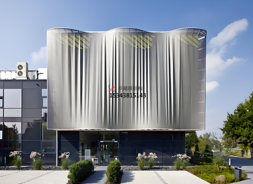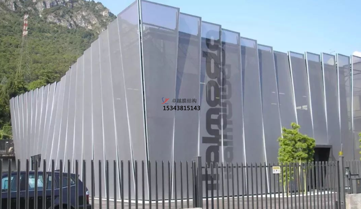 膜結(jié)構(gòu)幕墻是膜結(jié)構(gòu)在建筑外圍護(hù)結(jié)構(gòu)的應(yīng)用,以耐候性的柔性織物作為圍護(hù)材料,結(jié)合框架系統(tǒng),對(duì)既有建筑的外立面進(jìn)行翻新改造或新建筑外立面設(shè)計(jì)應(yīng)用的一種建筑外立面解決方案。膜結(jié)構(gòu)充滿張力且富于變化的曲面,自在靈敏的大空間、透明半透明膜材所構(gòu)成的明亮而又溫和的室內(nèi)環(huán)境,桅桿、拉索、精致的金屬節(jié)點(diǎn)等所表現(xiàn)的富有現(xiàn)代氣息的結(jié)構(gòu)技術(shù),給人們提供了有別于傳統(tǒng)幕墻結(jié)構(gòu)的全新視覺(jué)感受,它具有環(huán)保節(jié)能、可100%回收再利用、施工方便、重量輕、高強(qiáng)、高彈、高透光性、柔軟流暢、造型美觀、結(jié)構(gòu)固定簡(jiǎn)單等特點(diǎn)。