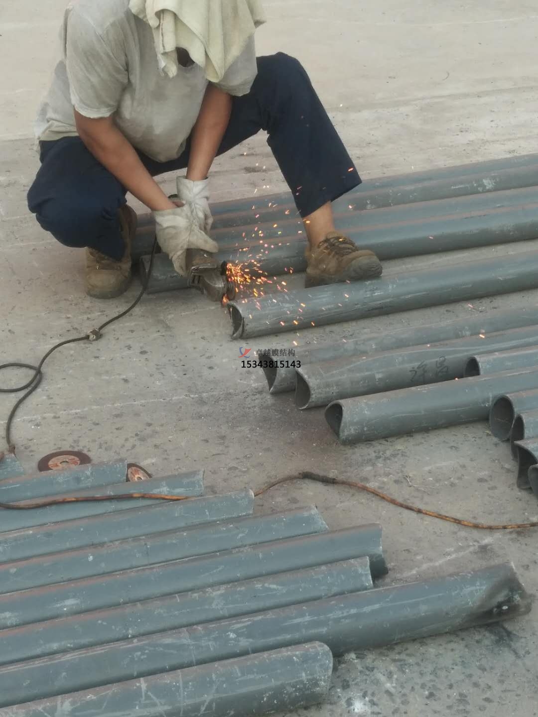 3)出廠檢查:膜結(jié)構(gòu)出廠時(shí)候要嚴(yán)格檢查鋼管切口角度有無(wú)偏差,焊縫有無(wú)漏焊,油漆是否噴涂均勻。
