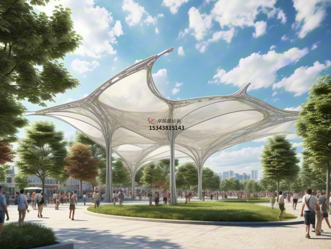 在當(dāng)代城市規(guī)劃與景觀設(shè)計(jì)中,膜結(jié)構(gòu)作為一種創(chuàng)新且充滿藝術(shù)感的建筑形式,正逐漸成為廣場(chǎng)和公園等公共空間的新寵。這種結(jié)構(gòu)以其獨(dú)特的形態(tài)、輕盈的質(zhì)感以及出色的環(huán)境融合性,為城市空間帶來(lái)了前所未有的視覺(jué)體驗(yàn)和功能提升。