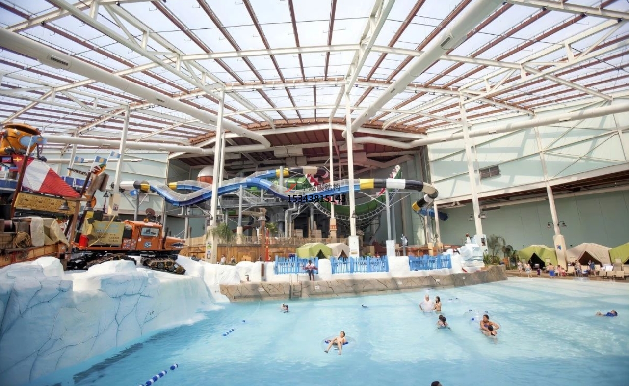輕盈透明的膜材如同巨大的泡泡,溫柔包裹水上樂園的一角。不僅有效阻擋紫外線,還能通過膜材的透光性,讓自然光柔和灑落,營造出夢(mèng)幻般的氛圍。孩子們?cè)谂菖菹骆覒?,仿佛置身于童話世界,安全又有趣?br />