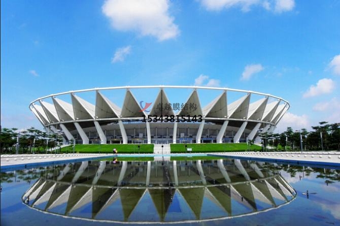 它的屋蓋為膜結(jié)構(gòu)屋蓋,屋蓋呈圓環(huán)型,外徑310米,內(nèi)徑125米。內(nèi)環(huán)由10根直徑8厘米的鋼索組成的受拉環(huán)。外環(huán)是受壓環(huán),分上下兩層,上層直徑310米,由直徑1米的鋼管混凝土組成;下層直徑275米,由直徑1.4米的鋼管混凝土組成,兩層鋼環(huán)間隔20m,中間由鋼管混凝土斜柱連接起來,形成倒圓臺(tái)形。
