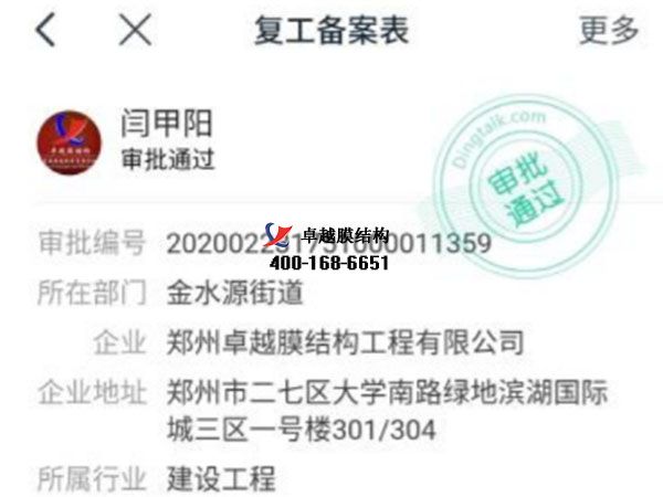 今天你復工了嗎?我們卓越膜結(jié)構(gòu)工程有限公司經(jīng)過層層審批,更終批準于2020年3月2號正式復工。