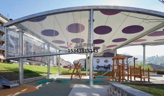 兒童游樂場所本就是趣致可愛的,迎合孩子們的喜好,配套遮陽設(shè)施的建設(shè)也應(yīng)該考慮在內(nèi),下面兩個(gè)遮陽項(xiàng)目屬于同一系列,波點(diǎn)圖案,活潑的色調(diào),再加上起伏的造型,讓人感覺輕松愉快。兩個(gè)項(xiàng)目都采用PVC+ETFE膜材。