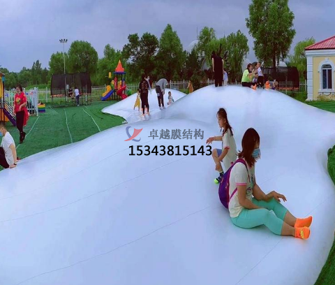 蹦蹦云的外膜材質(zhì)選用耐磨、抗陽光、自潔的膜材,保證外膜長期被人踩踏、暴曬、彈跳后,再次清洗后依然清潔。產(chǎn)品可長久性的固定在地面之上,拆卸維修方便。