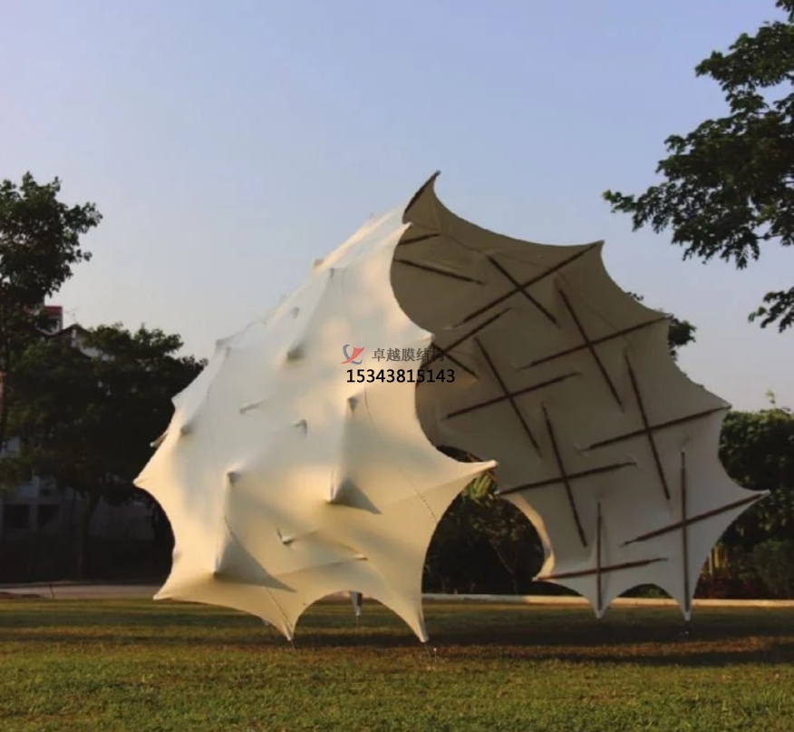 輕質高強,穩(wěn)固耐用:景觀膜結構采用的高強度薄膜材料,重量僅約為傳統(tǒng)建筑結構材料的十分之一,極大地減輕了自身重量。但 “輕量級” 的它卻有著超乎想象的強大實力,拉伸強度極高,在面對風荷載與雪荷載時,能憑借出色的韌性與剛性,展現(xiàn)卓越的穩(wěn)定性。在強風天氣中,膜結構可通過自身的柔性變形來緩沖風力,避免因剛性抵抗而導致結構損壞;面對積雪,其合理的造型與支撐設計能使積雪均勻分布或自然滑落,防止因積雪過重造成坍塌,為景觀設施提供可靠的安全保障。