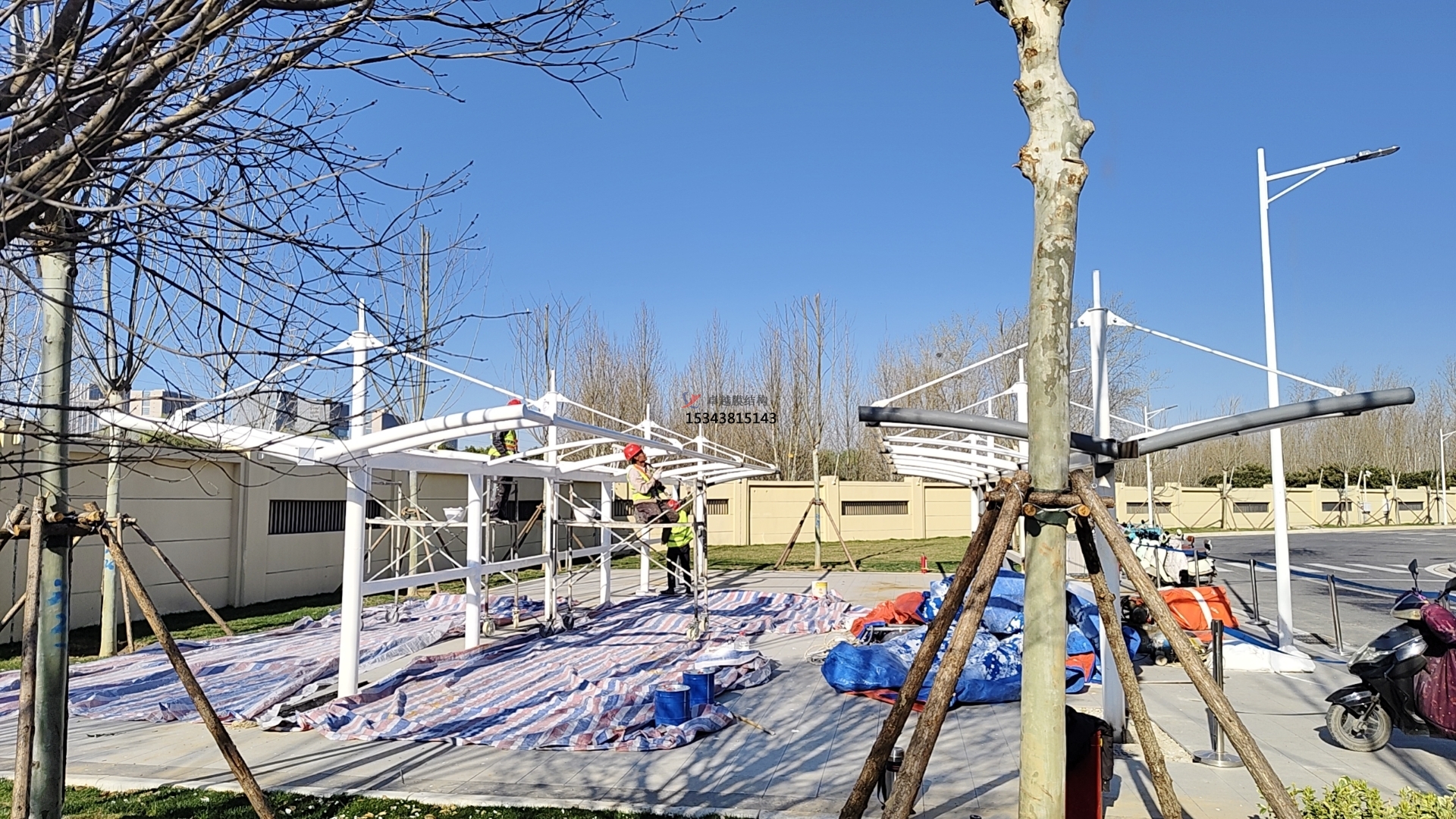 - 膜材張緊:在膜材固定和連接完成后,通過調(diào)整支撐結(jié)構(gòu)或使用專門的張緊設(shè)備,對膜材進行張緊,使其達到設(shè)計要求的張力狀態(tài)。張緊過程中要密切關(guān)注膜材的變形情況,確保其變形在允許范圍內(nèi),且膜面平整、無褶皺。同時,要使用測量儀器對膜材的張力進行監(jiān)測和控制,保證各部位的張力符合設(shè)計值。