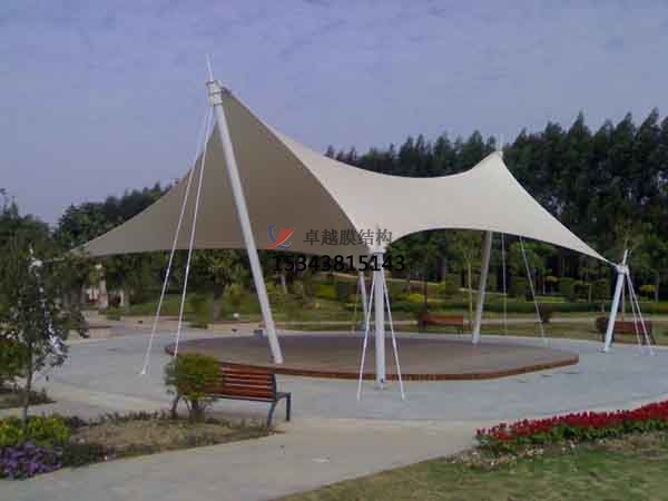 膜結(jié)構(gòu)是一種由高強(qiáng)膜材料和強(qiáng)構(gòu)件(鋼結(jié)構(gòu)或拉索)通過一定方式使其內(nèi)部產(chǎn)生一定的張應(yīng)力以形成某種空間形狀,可作為覆蓋結(jié)構(gòu)并能承受一定的外荷載的空間結(jié)構(gòu)形式。膜結(jié)構(gòu)以良好的自潔性、隔熱性以及高強(qiáng)耐久、造型新穎、自重輕等優(yōu)點(diǎn)廣泛應(yīng)用于休閑小區(qū)、輕型大跨度無柱空間或輕型屋蓋建筑結(jié)構(gòu)。