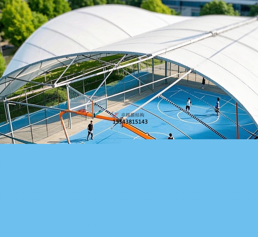 鋼膜結構頂棚:以鋼結構建立骨架,上方覆蓋膜材,這種方式應用廣泛,能有用維護籃球場所,削減修理費用。其大跨度特點可完成大面積遮蔽,且藝術造型招引眼球。