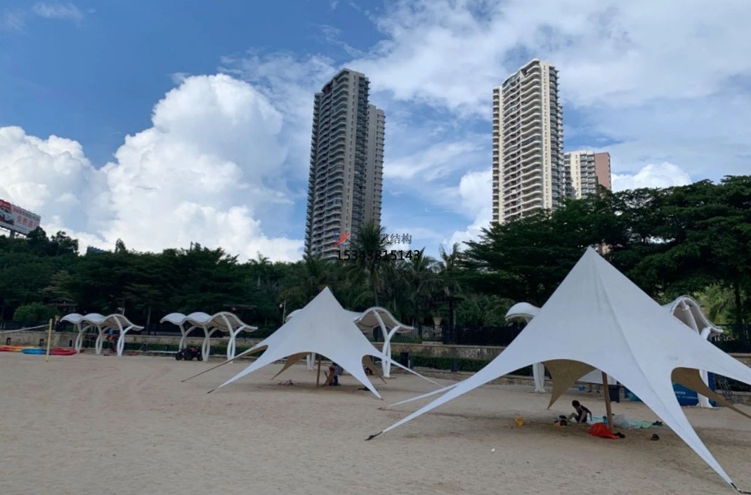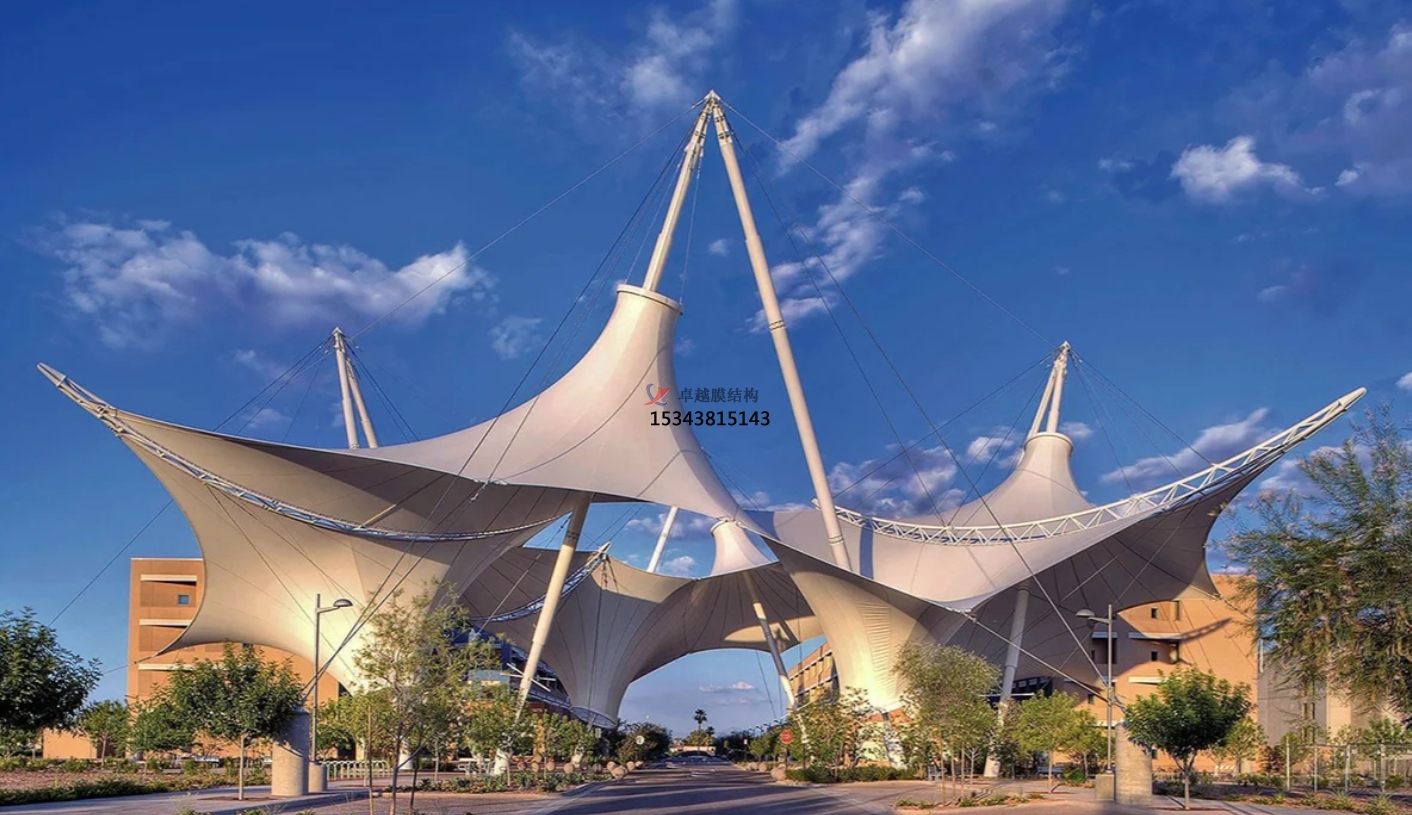 景觀(guān)棚膜結(jié)構(gòu)最大的特點(diǎn)之一就是其幾乎不受限制的造型能力。設(shè)計(jì)師可以根據(jù)不同的場(chǎng)地需求、文化背景以及功能要求,創(chuàng)造出如貝殼般優(yōu)雅的曲線(xiàn)、如帆船般靈動(dòng)的輪廓、如花朵般綻放的形態(tài)等等。這種獨(dú)特的造型不僅能夠成為視覺(jué)上的焦點(diǎn),提升整個(gè)區(qū)域的景觀(guān)品質(zhì),還能很好地與周?chē)淖匀画h(huán)境或建筑風(fēng)格相融合,形成和諧統(tǒng)一的整體畫(huà)面。