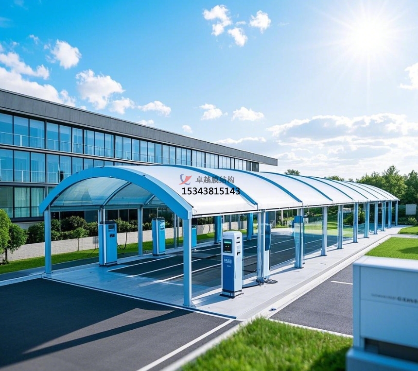 ??????? 膜結(jié)構(gòu)罩棚以其流暢的曲線、共同的造型,為充電站增添了異樣的美學(xué)魅力。它打破了傳統(tǒng)修建的刻板印象,展現(xiàn)出輕盈、靈動(dòng)的現(xiàn)代風(fēng)格。膜材的色彩豐富多樣,可根據(jù)充電站全體規(guī)劃風(fēng)格與周邊環(huán)境進(jìn)行挑選搭配,或是挑選新鮮明快的色彩,營造舒適迷人的氣氛;或是與周邊修建色彩相呼應(yīng),融入城市景觀。比方,位于城市公園附近的充電站,選用綠色彩的膜結(jié)構(gòu)罩棚,與公園的天然環(huán)境相輔相成,成為城市中的一道亮麗風(fēng)景線,提升了城市形象。