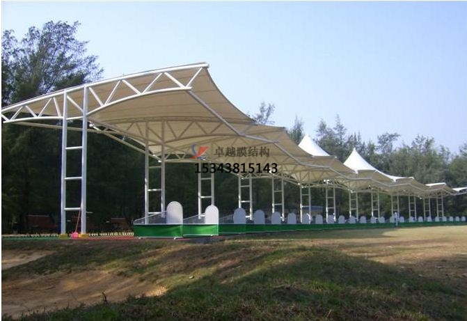 景觀膜結構遮陽棚膜材,是由纖維編織成織物基材,在其基材兩面以樹脂為涂層材所加工固定而成的材料,中心的織物基材分為聚酯纖維及玻璃纖維,涂層材使用的樹脂有聚氯乙烯樹脂(PVC),聚四氟乙烯樹脂(PTFE),二氟化樹脂(PVDF)等。