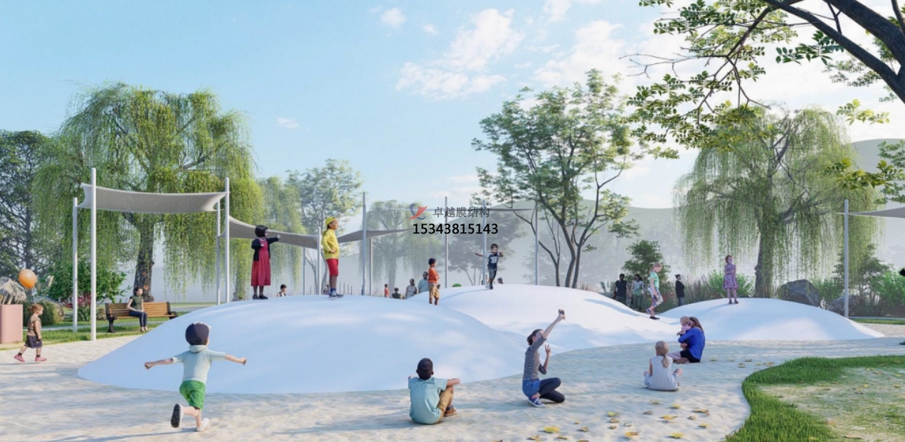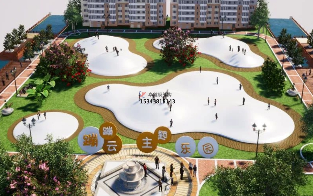蹦蹦云的造型具有一定的吸引力。整體可以設(shè)計(jì)成單球、雙球、多球等錯(cuò)落分布,視覺上帶給人一定的沖擊。在顏色選擇上也可以選擇不一樣的顏色,與周圍環(huán)境區(qū)分開,更突出玩耍設(shè)備帶來的吸睛效果。
