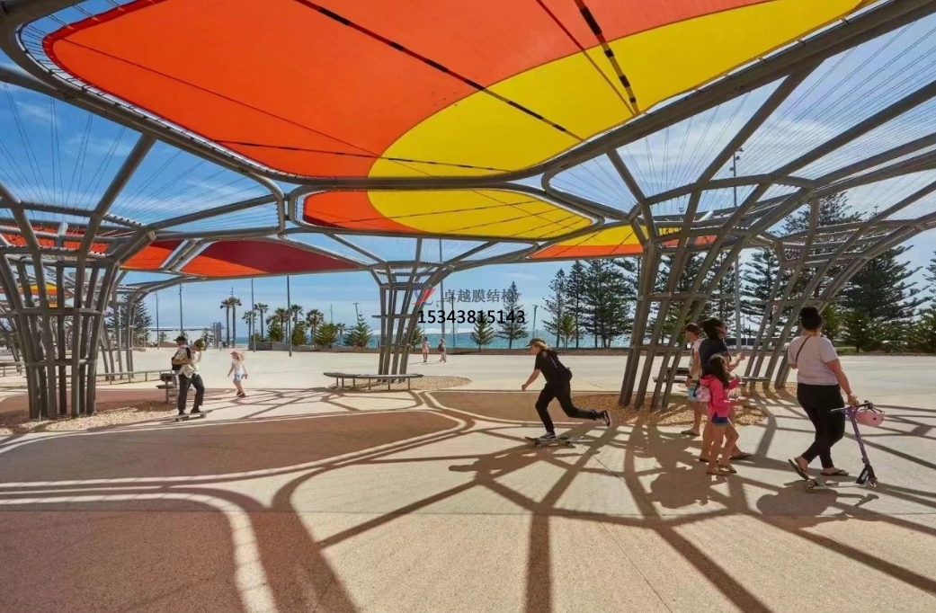 未來的景觀棚膜結(jié)構(gòu)將不再僅僅局限于單一的遮陽避雨功能,而是會(huì)朝著多功能融合的方向發(fā)展。比如,在景觀棚內(nèi)集成光伏發(fā)電系統(tǒng),將太陽能轉(zhuǎn)化為電能,實(shí)現(xiàn)能源的自給自足;或者結(jié)合聲學(xué)設(shè)計(jì),使其具備良好的隔音效果,可用于舉辦小型音樂會(huì)、演講等活動(dòng);還可以與水幕景觀、噴泉等水景元素相結(jié)合,打造出更加豐富多彩的戶外體驗(yàn)空間。