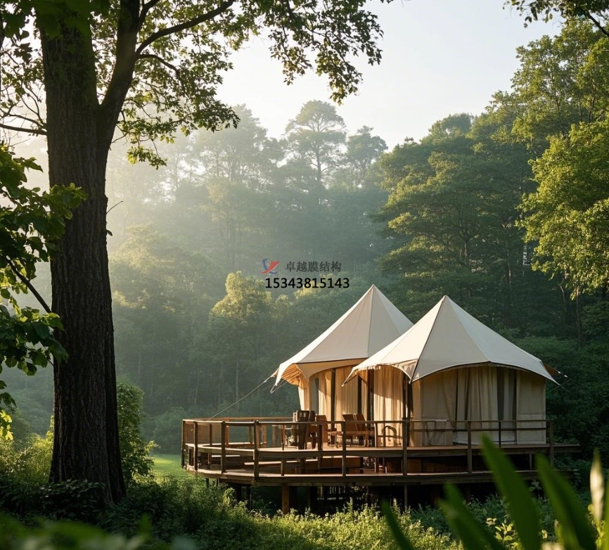 森林帳篷酒店:隱匿于茂密森林之中,如浙江湖州莫干山 Anadu 帳篷酒店。四周綠樹(shù)環(huán)繞,鳥(niǎo)鳴啁啾,帳篷與參天大樹(shù)、潺潺溪流為伴。清晨,陽(yáng)光透過(guò)樹(shù)葉縫隙灑在帳篷上,喚醒沉睡的旅人;夜晚,伴著輕柔的風(fēng)聲和偶爾的蟲(chóng)鳴入眠,仿若與自然合為一體,是渴望靜謐、享受森林浴游客的首選。